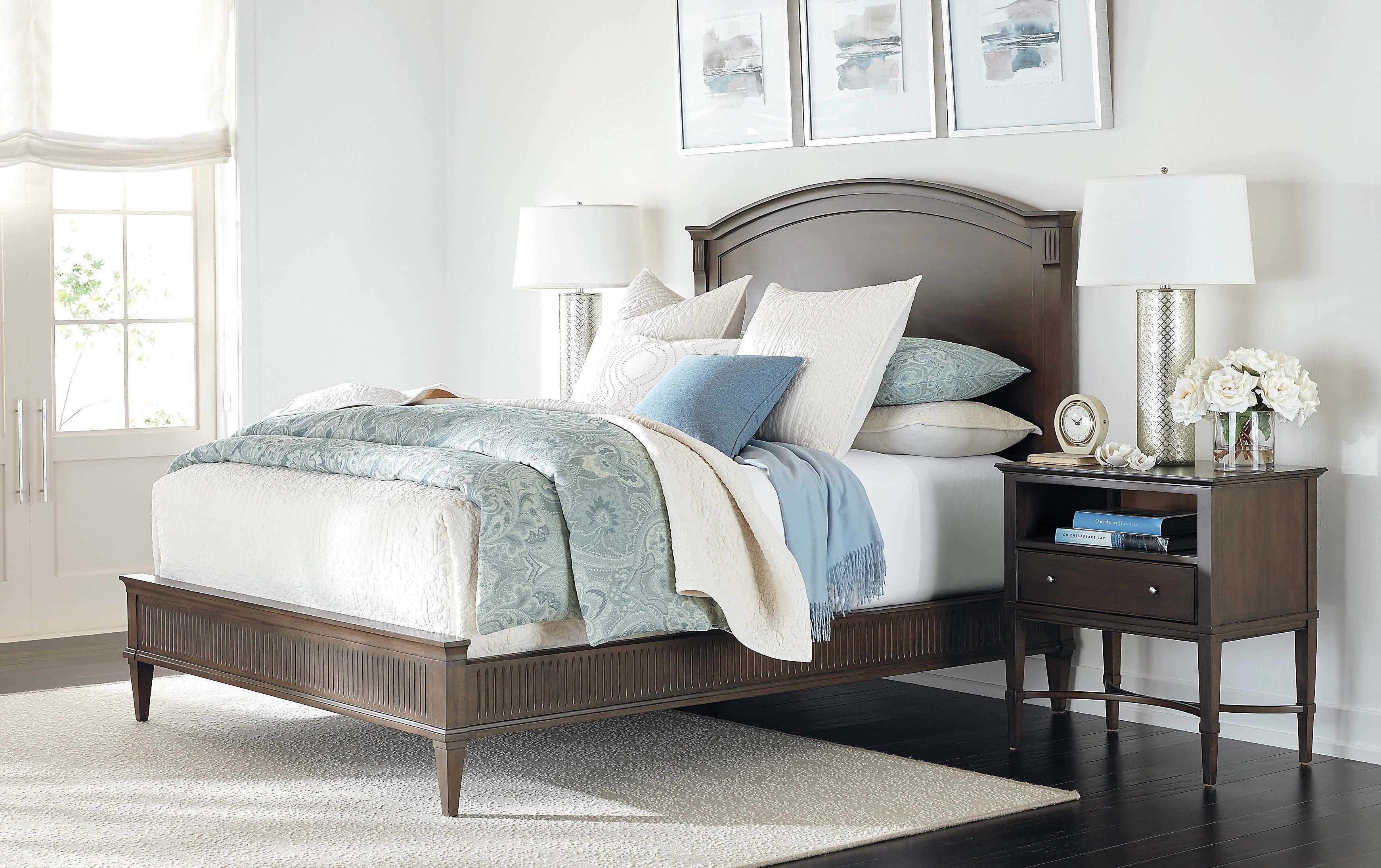 Charming details—our Burke bed’s spindle headboard and turned legs, layered bedding in summery seaglass tones—define a setting where you can instantly unplug.