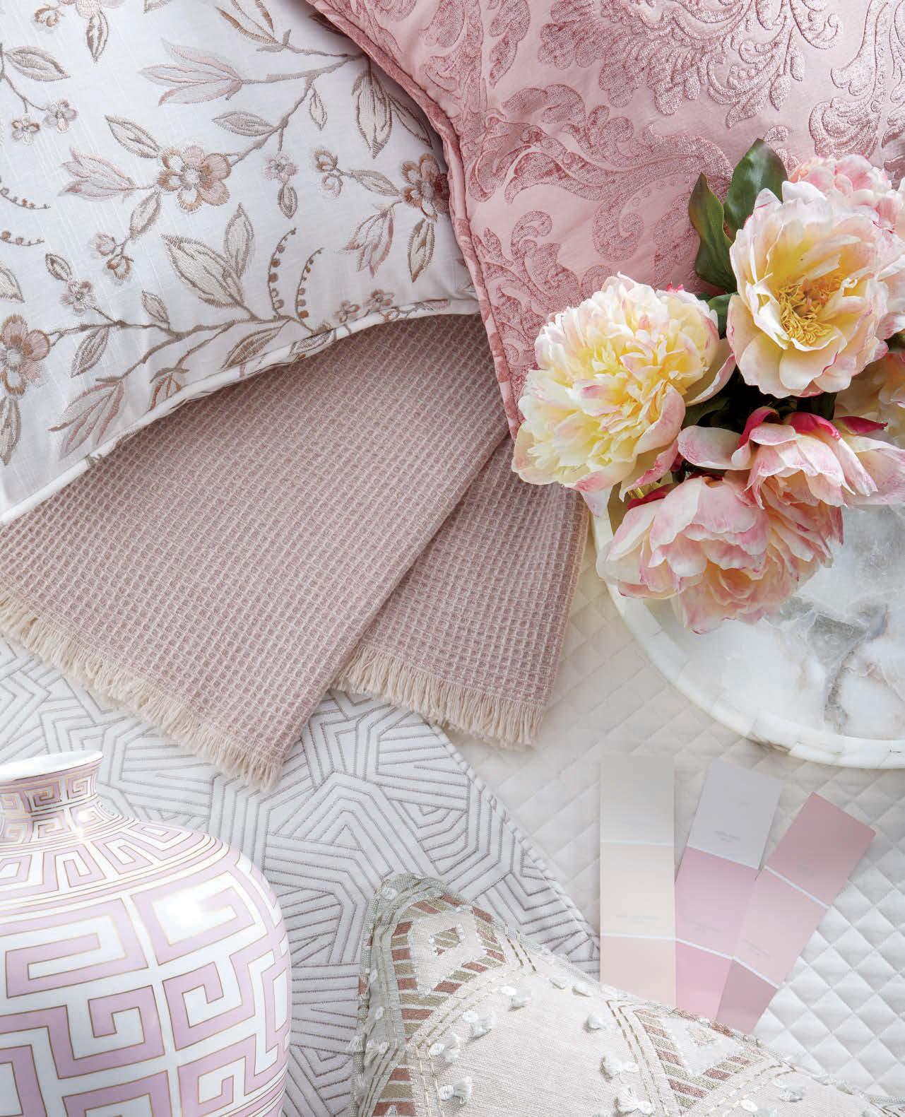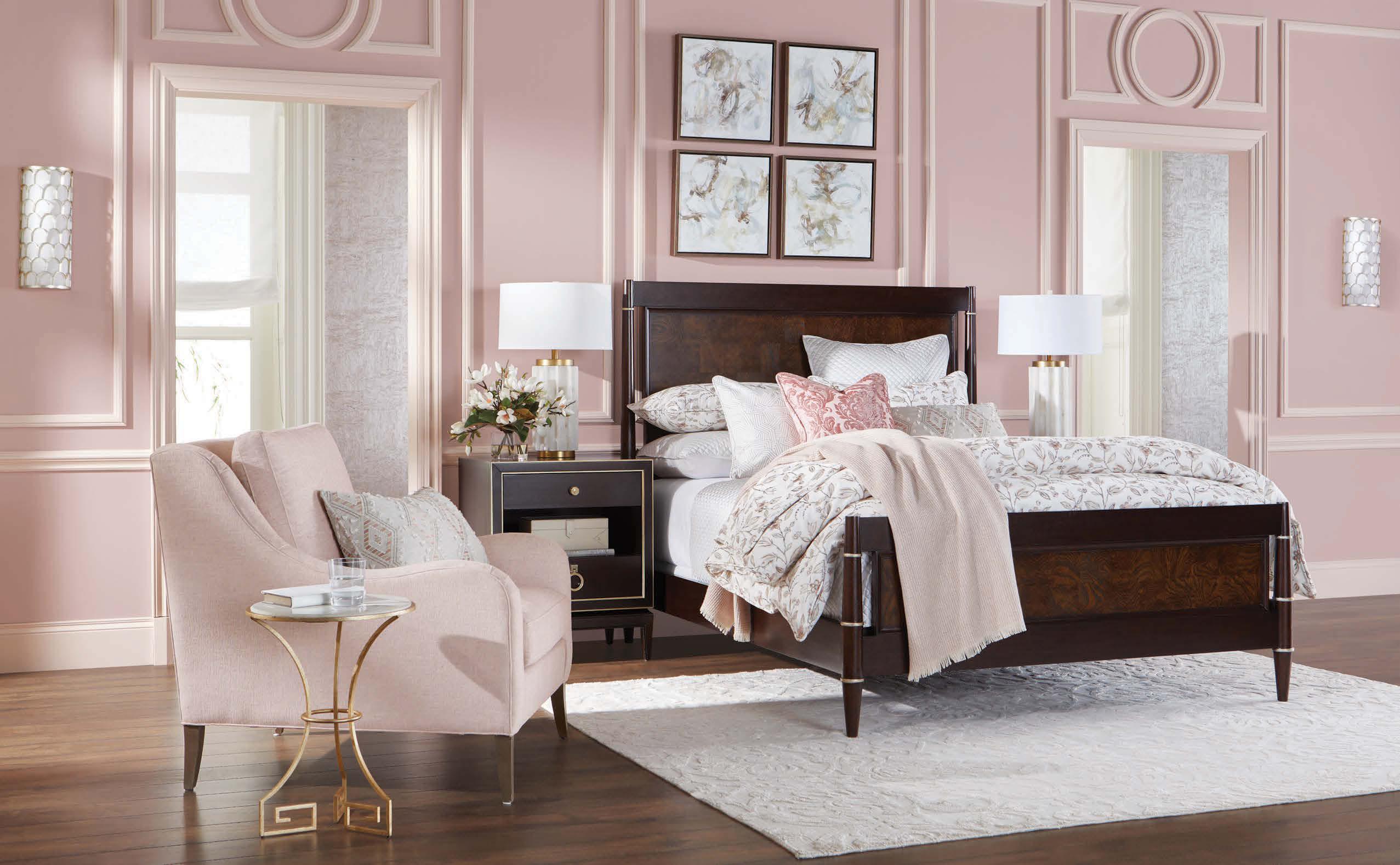 SOFT PINK IS A BEAUTIFUL COMPLEMENT TO THE WARM WALNUT TONES AND STUNNING OLIVE ASH BURL VENEER WORK ON OUR CLEMENT BED.
