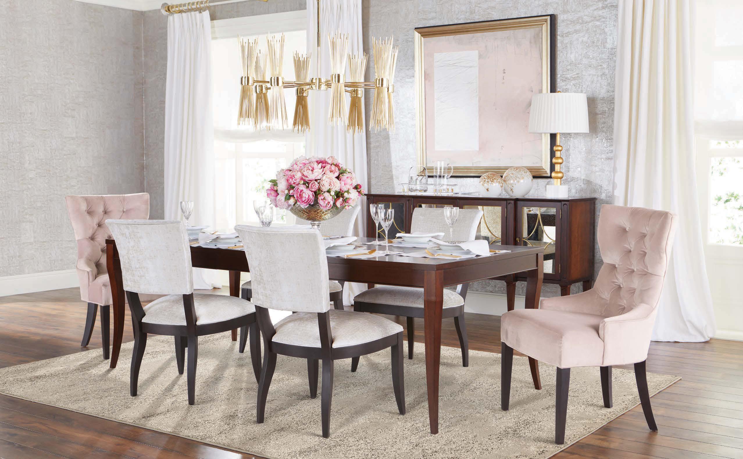 AS LIGHT AND BUBBLY AS A POP OF PROSECCO. THE HANDCRAFTED BARRYMORE TABLE AND NORWICH SIDEBOARD ADD RICH, DARK WALNUT NOTES.