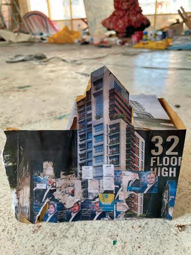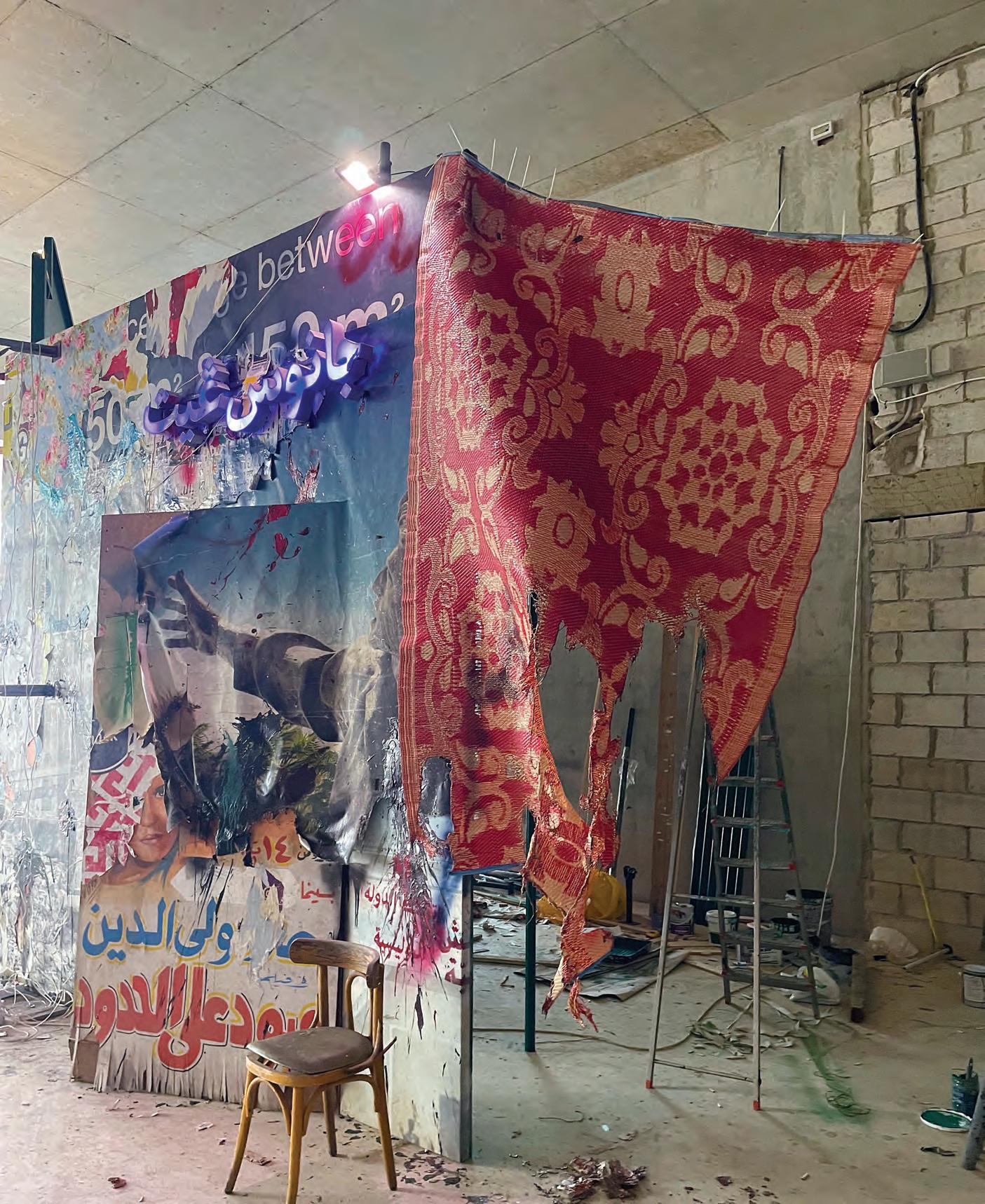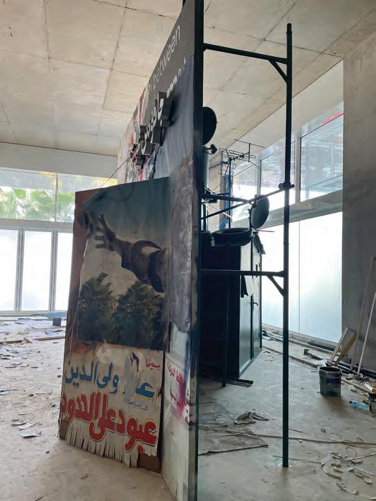 I hurried as light rain began to fall, following a two-day storm. I stepped in and saw what I felt I had seen before, over and over. Ayman’s installation was an intricate mix of children’s toys and adult mindfulness. I contemplated the construction: it was flooded with paint and commercial Egyptian movie posters, through one of its cracks an old television was seen on the floor. I remembered Beirut buildings after the explosion, as seen on television in Damascus. I remembered Ayman tearing up a billboard in the Paris metro.