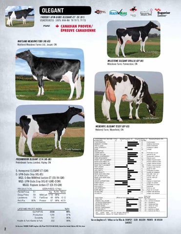 S: Honeycrest Elegant-ET (GM) D: UFM-Dubs Oroy (VG-85) MGS: O-Bee Manfred Justice-ET (EX-94-GM) MGD: UFM-Dubs Eroy (VG-87-GMD-DOM) MGGS: Roylane Jordan-ET (EX-95-GM) PRODUCTION GEBV/VEEG 12*Apr Herds/Troup. 51 Kg % RK %Dev Daug./Filles 59 Milk/Lait 1716 96% Lactations 79 Fat/Gras 49 89% -0.12 Rel./Fia. 90% Protein 57 98% +0.01