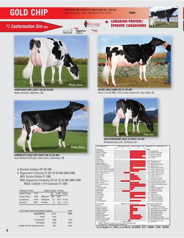 S: Braedale Goldwyn (GP-84-GM) D: Regancrest S Chassity-ET (EX-92-EX-MS-GMD-DOM) MGS: Picston Shottle-ET (GM) MGD: Regancrest Cinderella (EX-92-2E-EX-MS-GMD-DOM) MGGS: Calbrett-1 H H Champion-ET (GM) PRODUCTION Herds/Troup. 475 Daug./Filles 959 Lactations 1168 Rel./Fia. 98%