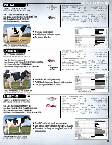 USDA-CDCB Genomic Eval. (08/13) (Rel 74%) +1,636Milk % Test Lbs. Net Merit (Rel 70%) +$ 832 Protein + .05 + 62 Cheese Merit +$ 899 Fat + .13 + 94 Fluid Merit +$ 779 USDA/HA Genomic Evaluation (08/13) +2.89Type Rel 73% GTPI +2435 HA Composites +2.54UDC +1.03FLC +0.97BD +1.79D SCS 2.82 (Rel 70%) PL +5.1 (Rel 67%) DPR +1.3 (Rel 66%) Calving Ease (%DBH) 08/13 Service Sire 6.7% 59% Rel Daughter 5.0% 55% Rel