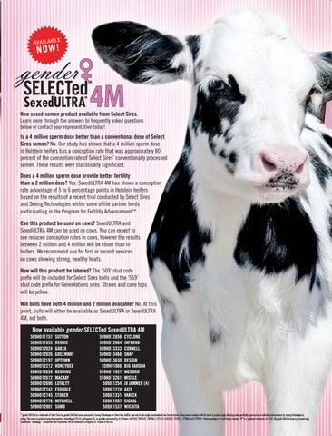 ™gender SELECTed is a trademark of Select Sires Inc. gender SELECTed semen processed by Sexing Technologies for Select Sires shall be used only for the single insemination of one female bovine during natural ovulation with the intent to produce single offspring unless specifically approved on an individual customer basis by Sexing Technologies in writing. This semen is produced using the proprietary technology of XY LLC and Inguran LLC, as partially represented by U.S. Patents: 6372422, 7094527, 7208265, 7371517, 6357307, 7723116, 7758811and 7799569. Patents pending in US and foreign markets. XY® is a registered trademark of XY LLC. All gender SELECTed semen is processed using SexedULTRA™ technology. ™SexedULTRA and SexedULTRA 4M are trademarks of Inguran LLC. Product of the USA.