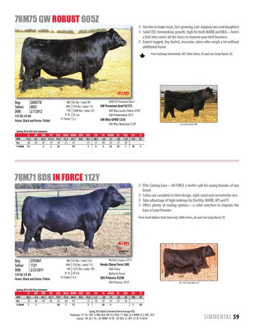 ◊ Use him to make stout, fast-growing, sale-topping sons and daughters ◊ Solid CED, tremendous growth, high for both MARB and REA—here’s a bull who covers all the bases to improve your beef business ◊ Expect rugged, big-footed, muscular calves who weigh a lot without additional frame From Gateway Simmentals, MT; Gibbs Farms, AL and Cow Camp Ranch, KS