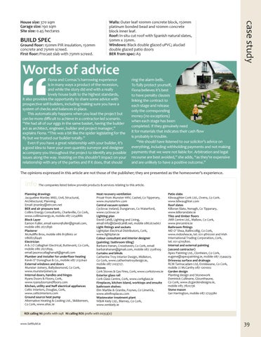 Heat recovery ventilation Proair from Munster HRV, Cashel, Co Tipperary, www.munsterhrv.com Central vacuum system Cyclovac Ireland, Dungarvan, Co Waterford, www.cyclovac.ie Lighting plan David Cahill, Lighting and Living, email info@davidcahill.net, mobile 0862674667 Light fittings and sockets Lightplan Electrical Distributors, Cork, www.lightplan.ie Colour consultant and interior designer (painting / bathroom tiling) Barbara Hanan, Crosshaven, Co Cork, email barbarahanan@gmail.com, mobile 087 2508109 Curtains and blinds Catherine Troy Interior Design, Midleton, Co Cork, www.catherinetroydesign.ie, mobile 087 2103727. Stoves Cork Stoves & Gas Fires, Cork, www.corkstoves.ie Exterior glass rail Cork Glass Centre, Cork, www.corkglass.ie Fireplaces, kitchen island, worktops and ensuite bathroom shelves Elm Marble & Granite, Foynes, Co Limerick, www.elmfireplaces.com Wastewater treatment plant W&M Kiely Ltd., Blarney, Co Cork, www.wmkiely.ie