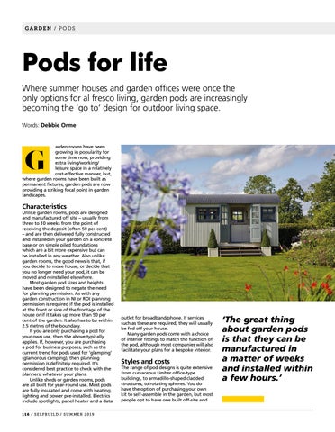 Pods for life Where summer houses and garden offices were once the only options for al fresco living, garden pods are increasingly becoming the ‘go to’ design for outdoor living space. Words: Debbie Orme