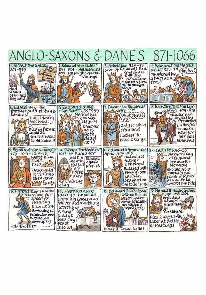 Which kings couldn’t speak English, or stammered when they could? Who were “Softsword” and “Sailor Bill”? Which king had 10 children with his mistress but none with his queen? Which kings were crowned twice? Which queen reigned for only 9 days? Which king disappeared? Here is a comic strip with a difference, an alternative (and funnier) Bayeux Tapestry tracing every king and queen from Alfred the Great to Charles III – each of their vivid pen-and-ink-portraits encapsulating the personal quirks and dramatic social change of their reigns. This single-sheet poster-sized booklet unfolds the politics, passions, and pageantry of the English and later British Royal Family, from 871 to 2023: the tyrants, eccentrics, warriors, and murderers, as well as the saints, scholars, patrons, and philosophers, whose joint story this is. Or, rather, their joined-up history, as the graphic artwork on the back illustrates, showing the complete Family Tree of the families and dynasties of our island story.
