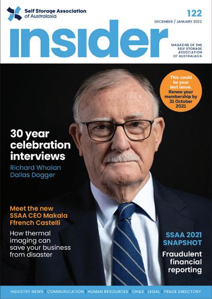 OCTOBER / NOVEMBER 2021 121 MAGAZINE OF THE SELF STORAGE ASSOCIATION OF AUSTRALASIA Insider INDUSTRY NEWS | COMMUNICATION | HUMAN RESOURCES | OH&S | LEGAL | TRADE DIRECTORY 30 year celebration interviews Richard Whalan Dallas Dogger SSAA 2021 SNAPSHOT New SIP regions launched Meet the new SSAA CEO How thermal imaging can save your business This could be your last issue. Renew your membership by 31 October 2021