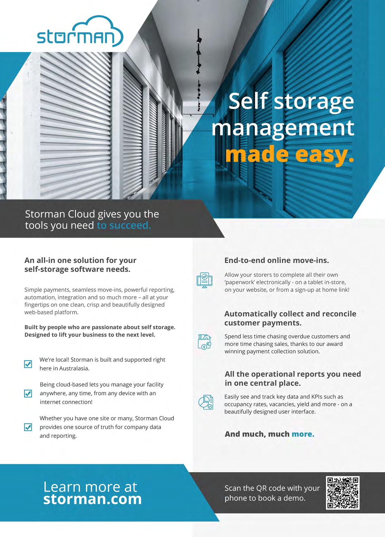 Insider magazine (Insider) is published bi-monthly by the Self Storage Association of Australasia Limited (ABN 23 050 341 725). This publication may not be reproduced or transmitted in any form, in whole or in part, without the express, prior written permission of the publisher. While every care has been taken in the preparation and publication of Insider, none of the Insider’s publisher, editor nor any of the publisher’s employees, subcontractors or contributors give any warranty as to the completeness or accuracy of the publication’s content, nor do any of them assume any responsibility or liability for any loss, damage or expense which may result from, or arise in connection with, any inaccuracy or omission in the publication. The views or opinions expressed in Insider are not necessarily those of Insider’s publisher or editor. Furthermore, Insider has the right to accept or reject any editorial and advertising material. All letters addressed to Insider will be regarded as ‘for publication’ unless clearly marked ‘Not for Publication’. All submissions to Insider may be edited for reasons of space or clarity and opinions expressed in letters published in Insider are those of the author, not of Insider’s publisher or editor.
