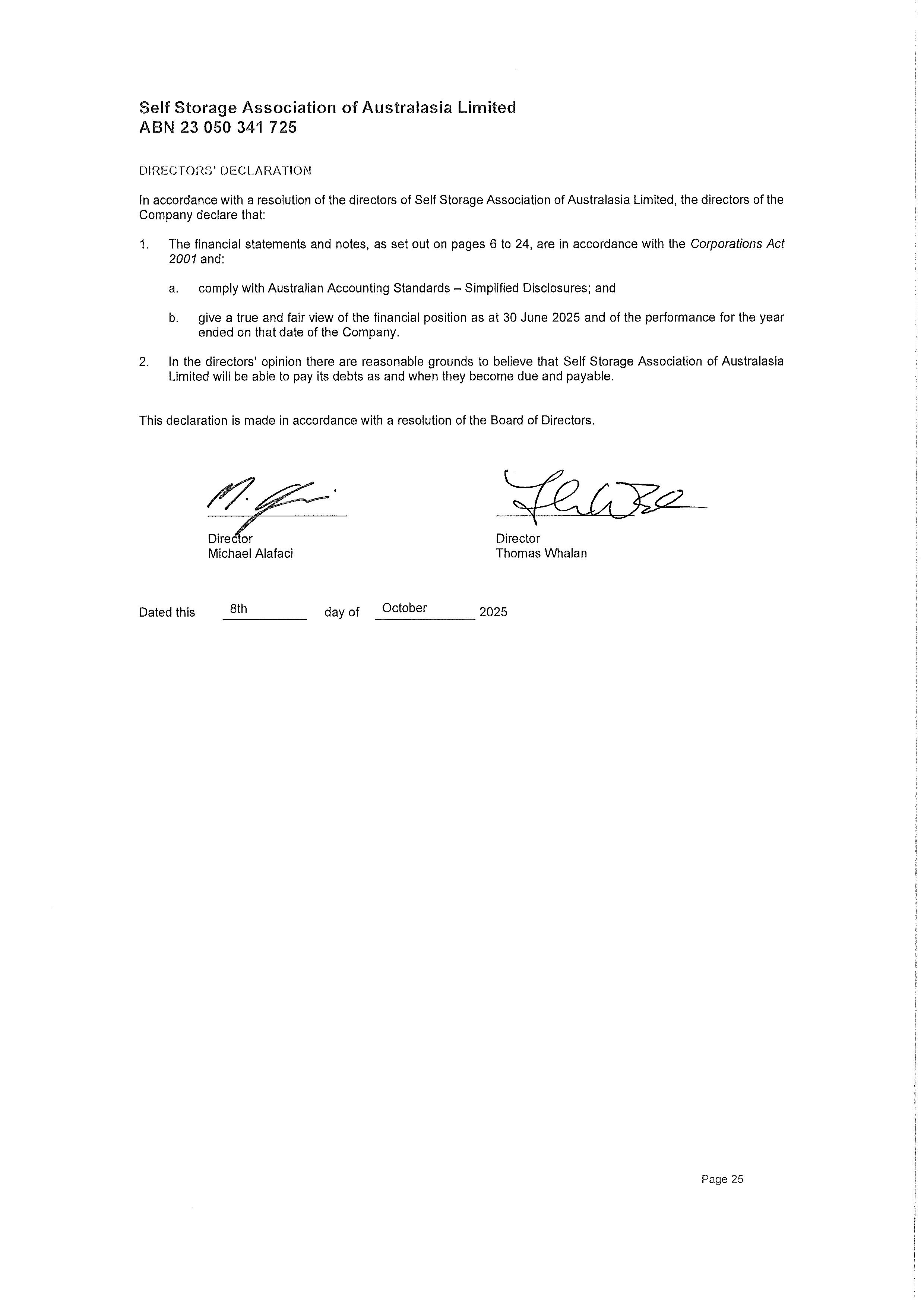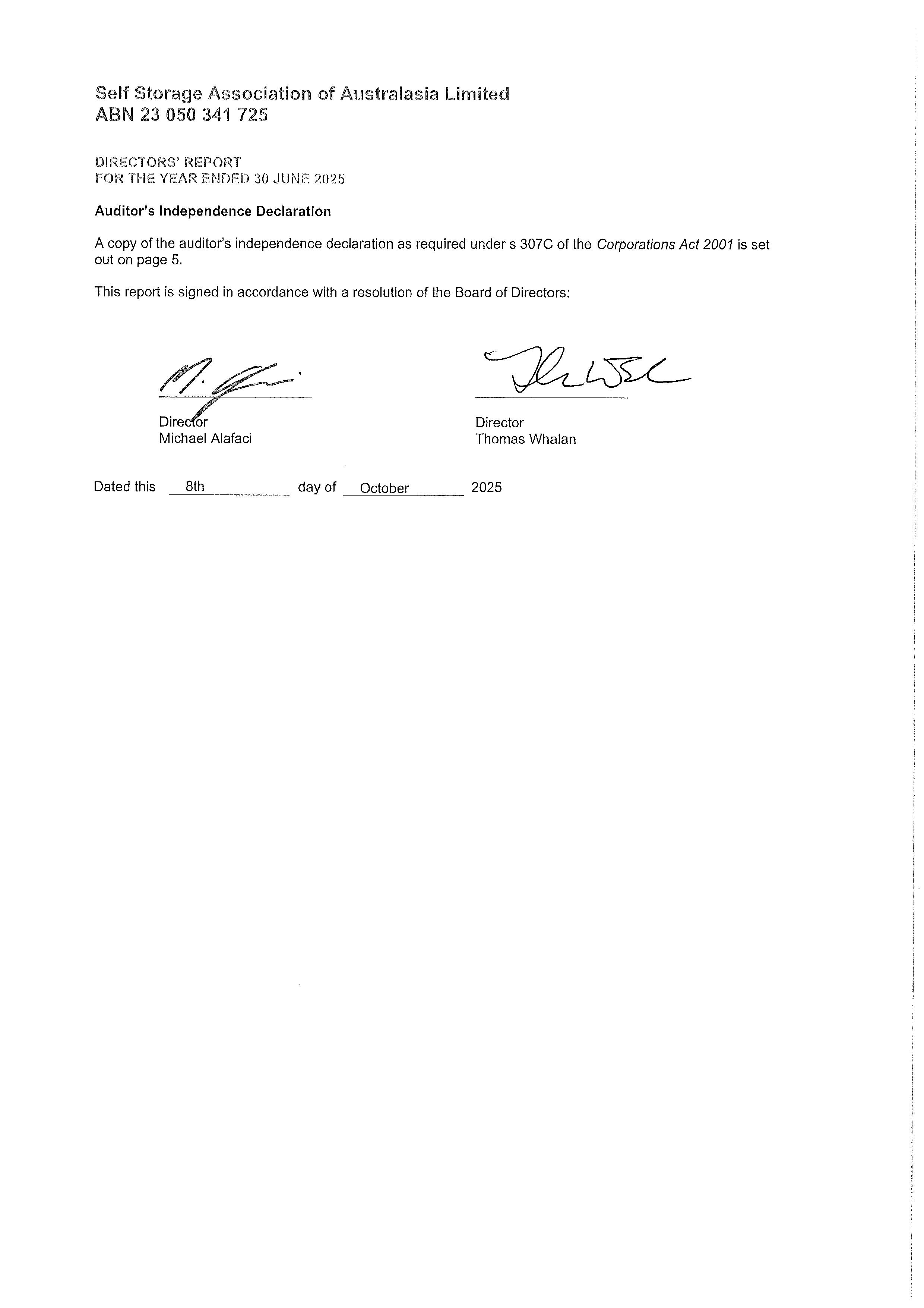 We have audited the financial report of Self Storage Association of Australasia Limited (the “Company”), which comprises the statement of financial position as at 30 June 2025, the statement of profit and loss and other comprehensive income, statement of changes in equity and statement of cash flows for the year then ended, notes to the financial statements, including a summary of significant accounting policies, and the directors’ declaration.