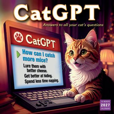 Answers to all your cat’s questions Ever wonder what cats would ask CatGPT? From “How can I lose weight?” to “Can cats work remotely?” these curious kitties have questions — and CatGPT has the purr-fect answers. Smart, funny, and surprisingly relatable, this new wall calendar proves we’re all just trying to land on our feet.