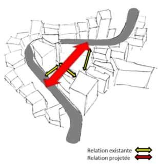 L’idée du projet est de créer un lien physique, matérialisé par un équipement architectural qui permettrai la suture des deux rives de la voie structurante du Telemly