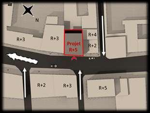 Situé au milieu d’habitation collectif sur une parcelle de 238 m², le projet porte une construction de 6 niveaux. La construction comprend logements sociaux, studios étudiants, logements haut de gamme, plateau de bureaux, plateau commercial, tout en exploitant la totalité de l’assiette.