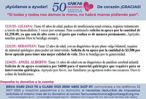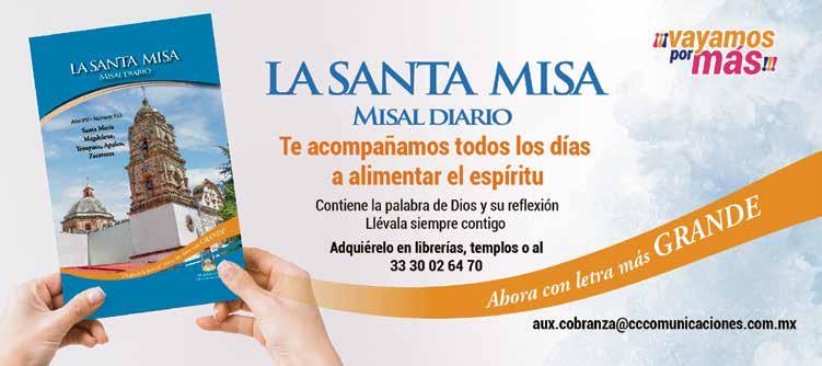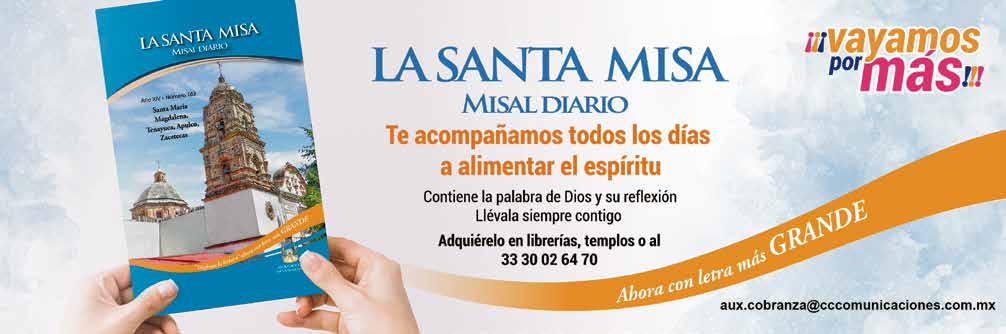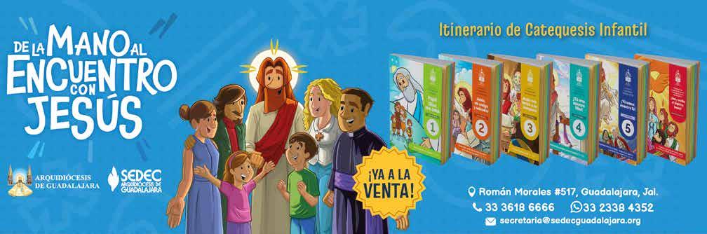 Semanario Arquidiocesano de Guadalajara Órgano de Formación e Información Católica Semanario Arquidiocesano de Guadalajara, fundado por el Sr. Cardenal Dn. Juan Sandoval Íñiguez, el 24 de enero de 1997 • Registrado ante la Comisión Calificadora de Publicaciones y Revistas Ilustradas —CCPRI— en Certificados de Licitud de Título y Contenido números 10296 y 7226 expediente 1/432“97”/13565 el 20 de enero de 1998 y en el Instituto Nacional de Derecho de Autor, bajo reserva al uso exclusivo del título 04-2018-021211450400-101 el 12 de febrero de 2018 • Registro Postal Publicación Periódica PP14-0002-2000, autorización por SEPOMEX No se devuelven originales. Los escritos firmados son responsabilidad del autor, no de la publicación ni del titular Es una publicación editada por Creator Comunicación, S. de R.L. de C.V., con oficinas y redacción en Isla Flores N. 3344-2, Col. Jardines de San José, Guadalajara, Jal., México, C.P. 44950 A.P. 3-31. Los anuncios que se muestran en Semanario son responsabilidad, única y exclusivamente, del solicitante. No nos hacemos responsables de los servicios que se publicitan.