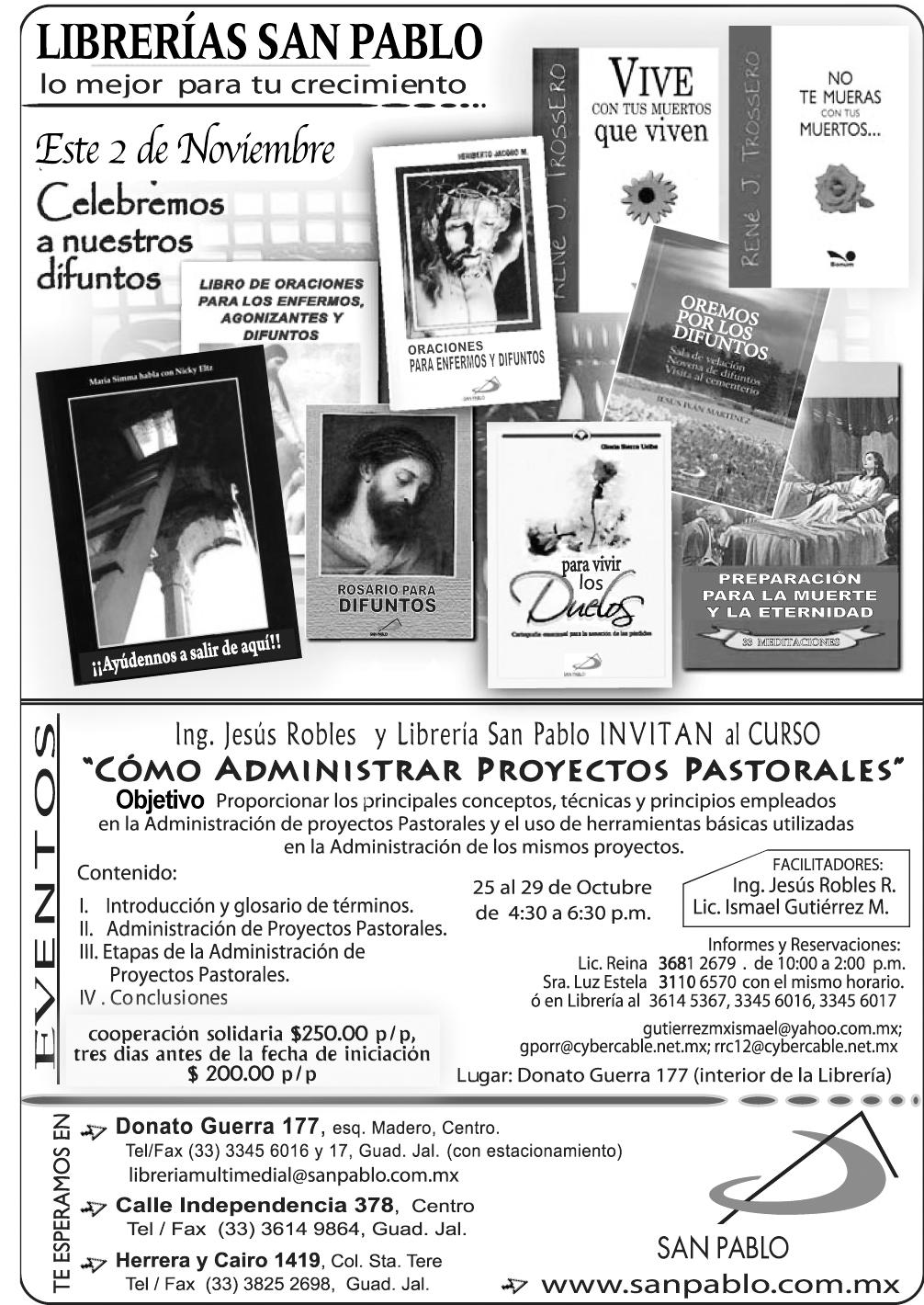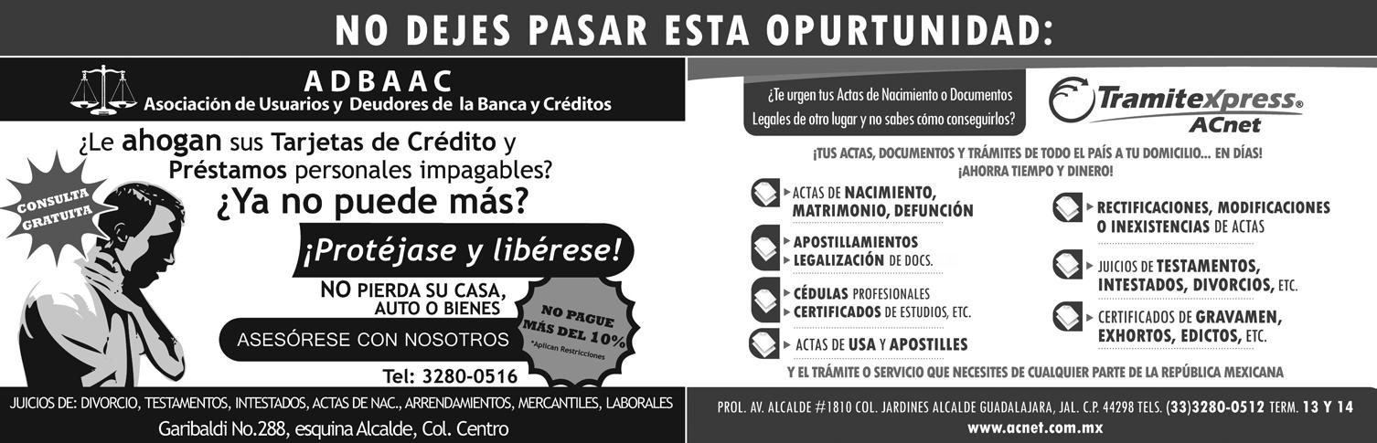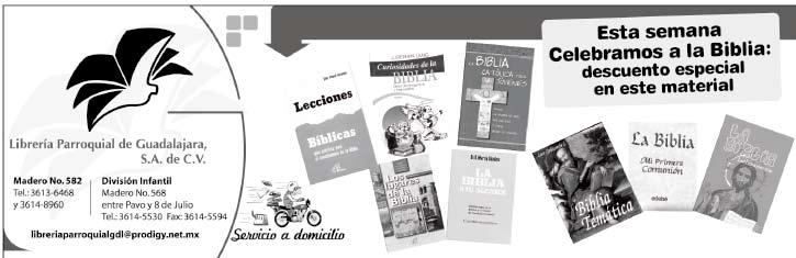 Semanario Arquidiocesano de Guadalajara ❙ Órgano de Formación e Información Católica Semanario Arquidiocesano de Guadalajara, fundado por el Sr. Cardenal Dn. Juan Sandoval Íñiguez, el 24 de enero de 1997 ❙ Registrado ante la Comisión Calificadora de Publicaciones y Revistas Ilustradas —CCPRI— en Certificados de Licitud de Título y Contenido números 10296 y 7226 expediente 1/432“97”/13565 el 20 de enero de 1998 y en el Instituto Nacional de Derecho de Autor, bajo reserva al uso exclusivo del título 04-2001-082208480600-101 el 22 de agosto de 2001 ❙ Registro Postal Publicación Periódica PP14-0002-2000, autorización por SEPOMEX ❙ No se devuelven originales. Los escritos firmados son responsabilidad del autor, no de la publicación ni del titular ❙ Es una publicación editada por Creator Comunicacion, S de RL de CV., con oficinas y redacción en Isla Flores No. 3344-2, Col. Jardines de San José, Guadalajara, Jal., México, C.P. 44950 A.P. 3-31. Teléfono: 3002-6470. Suscripciones ext. 1953 | Publicidad ext. 1925 | Redacción ext. 1922 Horario de oficina: 8:30 am. a 5:30 pm., correo electrónico: semanario@cccomunicaciones.com.mx Página Internet: http://www.semanario.com.mx • Distribución: Mensajería Tercer Milenio, Jarauta No. 510-A, Tels. 3618-9670, planta alta. Guadalajara, Jal. C.P. 44360 Impreso por: Ediciones Católicas de Guadalajara, S.A. de C.V. con oficinas en Isla Flores No. 3344, Col. San José, Tlaquepaque, Jalisco. Tels. 3002-6470. Tiraje: 37,000 a 40,000