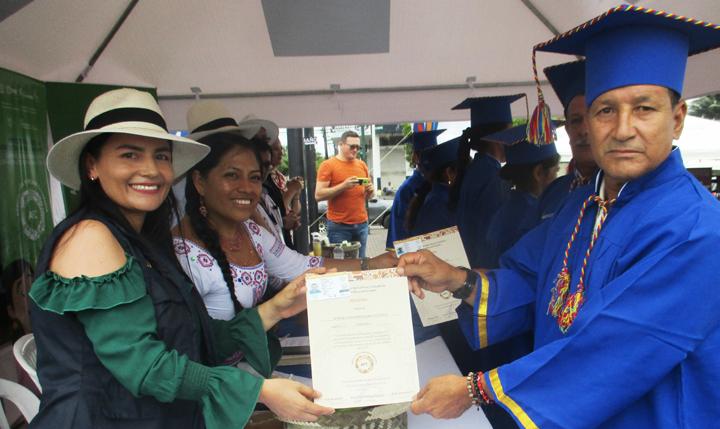 Los representantes de las instituciones auspiciantes se en cargaron de colocar la muceta y entregar los diplomas a los 48 graduados. Mientras en la feria la ciudadanía visitaba los 30 stands, que contenían una diversidad de productos de la zona.