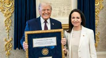 de la libertad y la prosperidad. La medalla del Premio Nobel de la Paz 2025, concedida a María Corina Machado. Presentada como símbolo personal de gratitud en nombre del pueblo venezolano, en reconocimiento a la acción firme y de principios del presidente Trump para asegurar una Venezuela libre. El coraje de Estados Unidos y de su presidente, Donald J. Trump, nunca será olvidado por el pueblo venezolano. María Corina Machado Washington, D. C. 15 de enero de 2026".