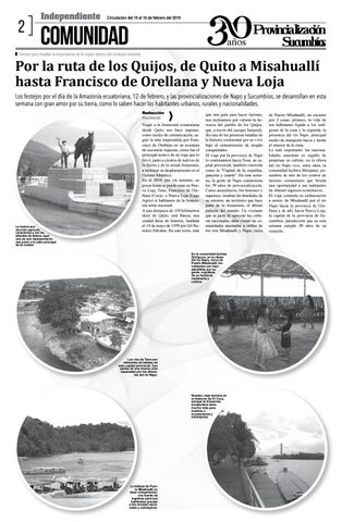 Por la ruta de los Quijos, de Quito a Misahuallí hasta Francisco de Orellana y Nueva Loja Los festejos por el día de la Amazonía ecuatoriana, 12 de febrero, y las provincializaciones de Napo y Sucumbíos, se desarrollan en esta semana con gran amor por su tierra, como lo saben hacer los habitantes urbanos, rurales y nacionalidades. Redacción Nacional