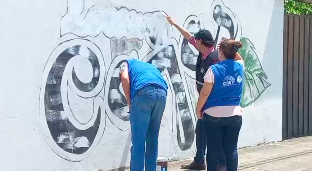 Posteriormente, las autori dades del CNE-Sucumbíos, procedieron a sobrepintar nom bres y propaganda de varios candidatos que se encontraban en algunas paredes de viviendas privadas en la ciudad.