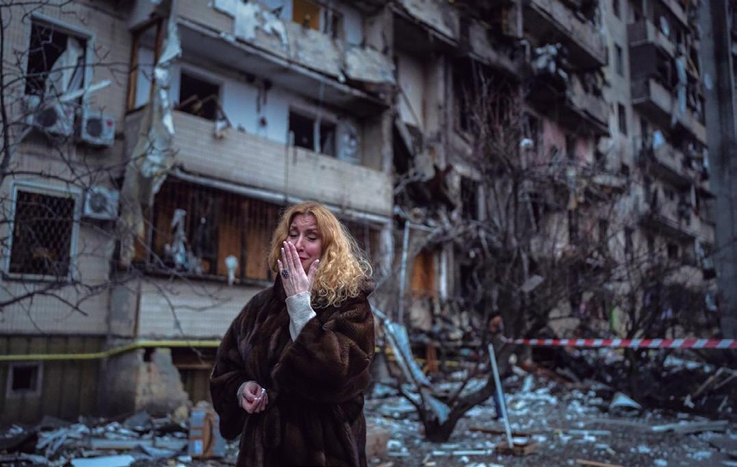 » Mujer se limpia las lágrimas despues de que su casa fue alcanzada por un cohete en Kiev, Ucrania. Foto: Emilio Morenatti / Associated Press