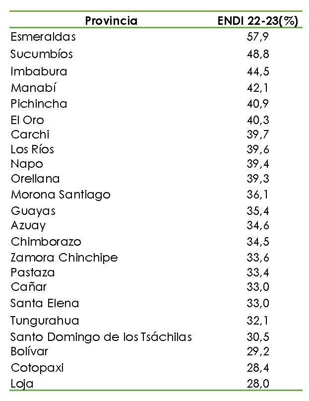 Es de interés, tocar ciertos datos tabulados que aparecen en la Encuesta Nacional de Desnutrición Infantil ENDI, realizada por el Instituto Ecuatoriano de Estadística y Censos INEC, que demuestran la realidad del país en este tema, con corte a septiembre de 2023. Dentro de este documento, es necesario abordar temas de interés nacional y provincial, cuyos efectos de no hacer nada, podrían afectar el desarrollo normal y la vida adulta de los niños que presentan desnutrición crónica infantil o DCI.