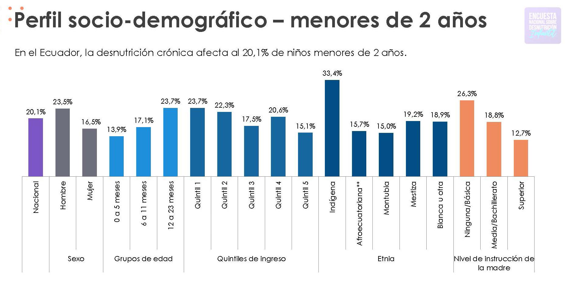 A nivel nacional, por sexos, la DCI se presenta más en hombres que en mujeres, al presentar indicadores de 23.5% para sexo masculino y 16,5% para femenino. Dentro de la variable edad, al mantener una base informativa de menores a 2 años, la DCI se presenta con mayor frecuencia en menores cuyas edades oscilan entre el mes 12 al mes 23. El dato para este rango de edad es de 23,7%. Según la etnia a la que se identifica al menor de edad, la indígena es la que presenta mayor DCI, al presentar un 33.4%.