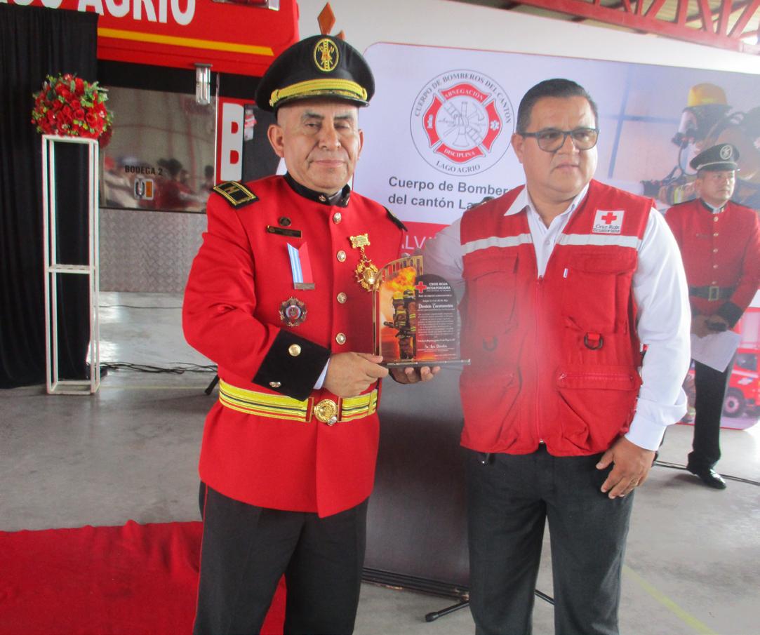 De parte de instituciones, en este caso, Cruz Roja Ecuatoriana, su titular Luis Dávalos entregó una placa de reconocimiento al coronel Dionisio Encarnación, jefe del Cuerpo de Bomberos de Lago Agrio.