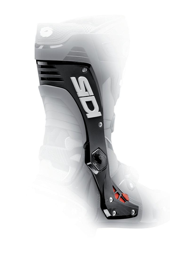 La protection du tibia a une coupe anatomique et est remplaçable. Cette pièce est un brevet Sidi.