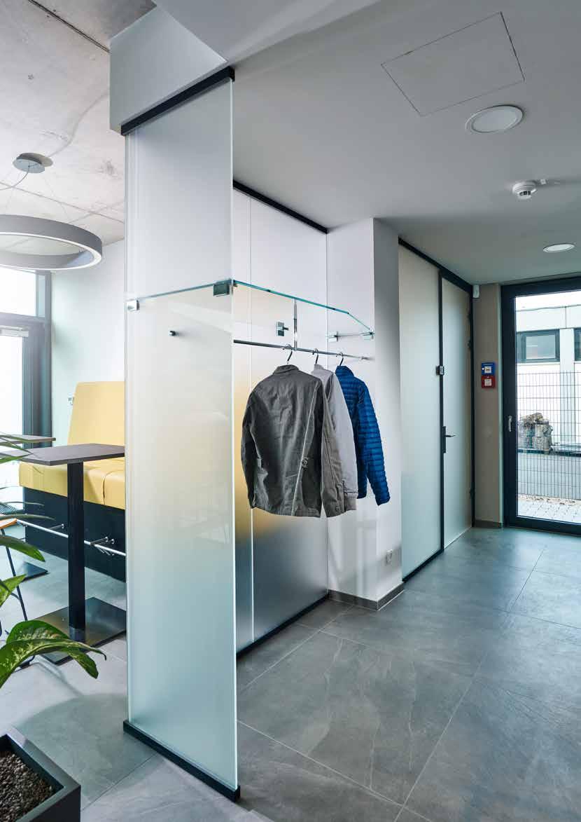 »Dreh- und Angelpunkt ist die Profilfarbe schwarz. Durch die umlaufende Einfassung der Gläser und der individuell einteilbaren Sprossenaufteilung ist die Glaswand nicht von einem echten stählernen Rahmen zu unterscheiden