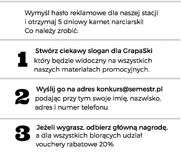 ADRES REDAKCJI I WYDAWCY Magazyn Semestr, Media Service, ul. Hufcowa 14, 52-244 Wrocław DRUK Media Magazines, Bydgoszcz WYDANIE INTERNETOWE www.semestr.pl, www.issuu.com/semestr ZAPRASZAMY DO WSPÓŁPRACY:
