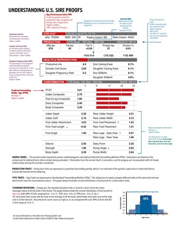 ANIMAL MODEL – The animal model represents proven methodology for calculating Predicted Transmitting Abilities (PTAs). Evaluations are based on the animal and its relationship to other animals being evaluated. Information from the animal itself, its ancestors, and its progeny are incorporated, with all known relationships among the animals considered. PRODUCTION TRAITS – Production traits are expressed in predicted transmitting ability, which is an estimate of the genetic superiority or inferiority that an animal will transmit to the offspring. TYPE TRAITS – Type Traits are expressed as Standardized Transmitting Abilities (STAs). This allows you to easily compare different traits of the same bull and see which traits have the most extreme values. The graph below illustrates normal distribution of bull proofs for conformation traits.