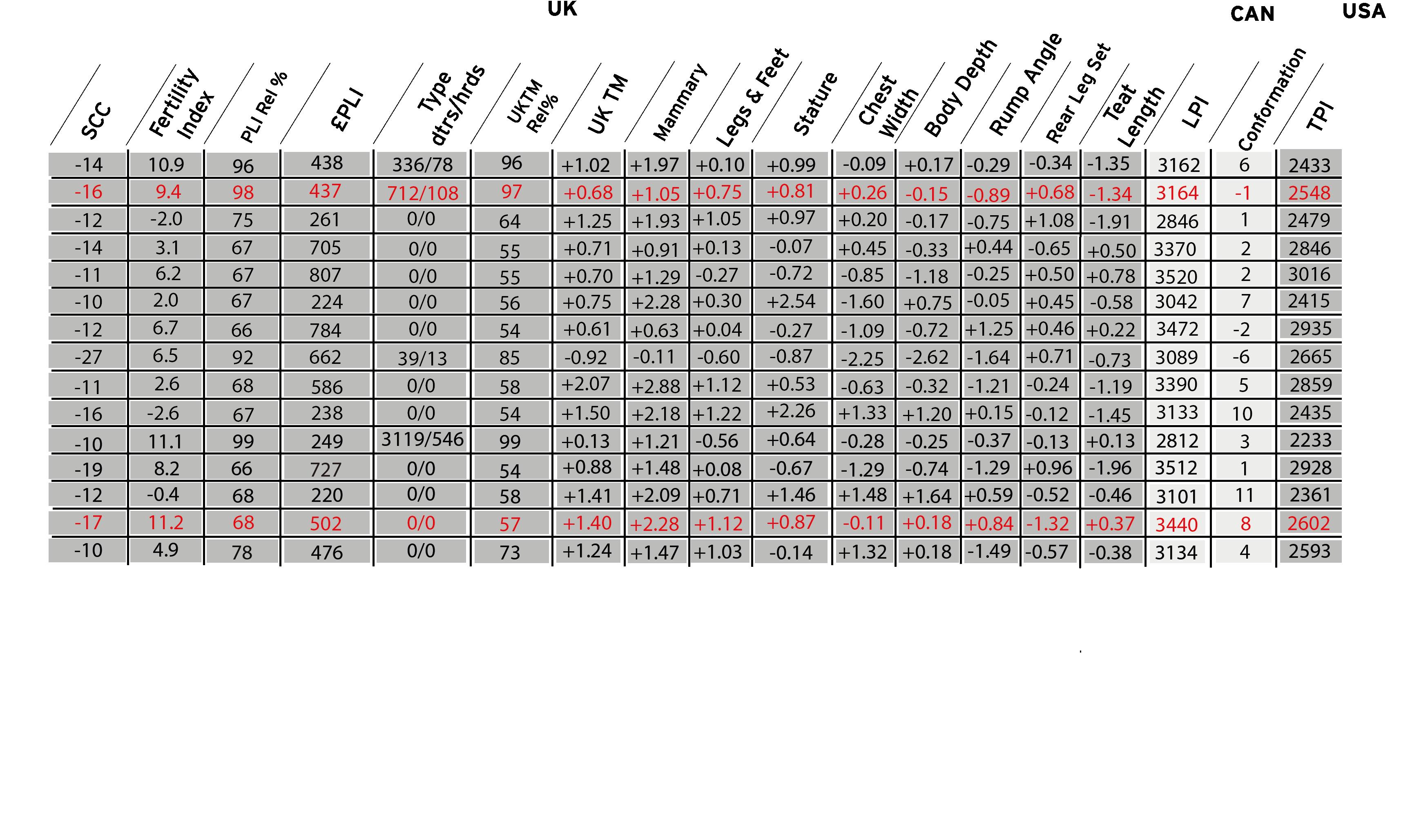4 HOLYSMOKES 839 RAPTORS 821 PARTNER 816 BRAVE 807 PATTERN 805 GRAZIANO 788 GREYCUP 784 ASCEND 780 EARLYBIRD 767 NIKON 766 TOTAL 762 RANGER RED 749 CHRONICLE 742 MIDMARCH 729 RAMSES 727 ZOLTON 716 EINSTEIN 712 MINGUS 711 ADIDAS 710 BANKSY 705 ALCOVE 697 OPINION 696 LUGNUT 692 ROCKNROLL 680 PHOTOBOOTH 671 UK PLI BRAVE 1156 ALCOVE 1122 LUGNUT 1057 BANKSY 1009 PARTNER 989 JAKERS 939 PATTERN 929 ALLIGATOR 925 FUEL 922 HOLYSMOKES 897 HAVENOFEAR 877 RANDALL 848 LATAYO 796 MATCHLESS 783 REDDIT 769 GREYCUP 756 RANGER RED 745 RAPTORS 743 SWINGMAN-RED 730 HANLEY 723 EINSTEIN 722 CHRONICLE 709 PURSUIT 698 CLARO 690 DEALMAKER 688 UK MILK KGS MIDMARCH 0.33 GRAZIANO 0.32 RAMSES 0.30 ASCEND 0.29 EARLYBIRD 0.26 YAMASKA 0.23 CHRONICLE 0.21 ZOLTON 0.21 RAPTORS 0.20 NIKON 0.20 ADIDAS 0.19 ALMAMATER 0.19 NUMERO UNO 0.19 TOTAL 0.18 LEMIEUX 0.18 OPINION 0.17 VERDICT 0.17 METALLICA 0.17 BARLOT 0.16 VINCENT 0.16 GREYCUP 0.15 ROCKNROLL 0.15 MINGUS 0.14 HAMPSHIRE 0.14 PHOTOBOOTH 0.13 UK FAT % YAMASKA 0.19 NIKON 0.18 GUARANTEE 0.17 METALLICA 0.16 MIDMARCH 0.14 VINCENT 0.14 RAMSES 0.13 GRAZIANO 0.12 EARLYBIRD 0.12 ROCKNROLL 0.12 VICTOR 0.12 ALMAMATER 0.11 TOTAL 0.11 ADIDAS 0.10 RETROLOOK 0.10 PERSEUS 0.10 ZOLTON 0.09 OPINION 0.09 BARLOT 0.09 ASCEND 0.08 RAPTORS 0.08 SIDEKICK 0.08 HOLYSMOKES 0.08 GREYCUP 0.07 HAMPSHIRE 0.07 UK PROTEIN % ALMAMATER 13.2 ROCKNROLL 12.6 SPEEDUP P 11.2 NUMERO UNO 11.1 ABBOTT 10.9 CHALLENGER 10.7 CLARO 10.4 ASCEND 10.3 PERSEUS 10.0 ZOLTON 9.8 EINSTEIN 9.4 ARMOUR 9.4 MINGUS 9.0 GRAZIANO 8.8 EARLYBIRD 8.6 PARTNER 8.4 RAMSES 8.2 PHOTOBOOTH 7.8 MIDMARCH 7.3 UNIX 7.1 ZIRCON-P 7.0 YAMASKA 6.9 GREYCUP 6.7 GUARANTEE 6.5 ADORABLE 6.4 UK FERTILITY INDEX RANGER RED 112 EINSTEIN 110 APPLICABLE 110 MILANO 109 SWINGMAN RED 108 CHRONICLE 108 RETROLOOK 108 ALMAMATER 108 PHOTOBOOTH 108 ASCEND 108 GUARANTEE 108 METALLICA 107 TOTAL 106 SPEEDUP P 106 PERSEUS 106 ARMOUR 105 CLARO 105 BARLOT 105 VERDICT 105 PATTERN 105 GREYCUP 104 PURSUIT 104 NIKON 104 MIDMARCH 104 ASHTON 103 MEDALIST 103 IMMUNITY HAMPSHIRE 2.49 CRUSHABULL 2.49 NASHVILLE 2.43 PURSUIT 2.33 APPLICABLE 2.33 RANDALL 2.21 VERDICT 2.15 TOTAL 2.14 FUEL 2.11 HANLEY 2.07 HAVENOFEAR 2.06 SOLARPOWER 2.05 RANGER RED 2.04 BULLSEYE 1.98 CLARO 1.90 PARTNER 1.88 PATTERN 1.85 LEMIEUX 1.83 LATAYO 1.81 DEALMAKER 1.80 JAKERS 1.78 REDDIT 1.76 TARMAC 1.72 PHOTOBOOTH 1.70 ZOLTON 1.67 UK TYPE MERIT NASHVILLE 3.40 HAVENOFEAR 3.07 DROPBOX 2.98 HARRIS 2.95 HANLEY 2.88 CRUSHABULL 2.79 SOLARPOWER 2.72 TARMAC 2.71 BAROLO 2.70 HAMPSHIRE 2.63 PATTERN 2.56 ZOLTON 2.55 VERDICT 2.54 CHALLENGER 2.54 JAKERS 2.47 REDDIT 2.44 APPLICABLE 2.42 SIDEKICK 2.36 BARLOT 2.33 VICTOR 2.28 SPEEDUP-P 2.28 BRAYDEN-P STAR RC 2.28 LEMIEUX 2.24 MEDALIST 2.18 DEALMAKER 2.16 UK MAMMARY APPLICABLE 2.88 CRUSHABULL 2.68 MINGUS 2.30 SWINGMAN RED 2.24 PURSUIT 2.20 TOTAL 2.18 RANDALL 2.03 VICTOR 1.99 FUEL 1.77 SOLARPOWER 1.73 HAMPSHIRE 1.67 RANGER RED 1.50 NASHVILLE 1.48 CLARO 1.45 MILANO 1.41 LATAYO 1.39 ADORABLE 1.32 ADIDAS 1.32 JAKERS 1.31 MEDALIST 1.22 LEMAGIC 1.18 PHOTOBOOTH 1.17 ASCEND 1.15 RETROLOOK 1.13 HANLEY 1.12 UK FEET & LEGS BULLSEYE 16 HARRIS 15 SIDEKICK 15 TARMAC 14 CRUSHABULL 14 ALLIGATOR 14 HAVENOFEAR 13 JAKERS 13 SOLARPOWER 12 LEMAGIC 12 VICTOR 11 DEALMAKER 11 BARLOT 11 MATCHLESS 11 SIDEROAD 11 HAMPSHIRE 11 BAROLO 11 MILANO 10 MEDALIST 10 FUEL 10 ASHTON 10 DROPBOX 10 RANGER RED 9 RANDALL 9 ZIRCON-P 9 CAN CONFORMATION ASCEND 114 PARTNER 108 GRAZIANO 108 GREYCUP 107 RAPTORS 107 PHOTOBOOTH 106 PERSEUS 106 BRAVE 105 ADIDAS 105 RAMSES 105 GUARENTEE 105 RANDALL 105 UNIX 105 MIDMARCH 104 PATTERN 104 NIKON 104 HANLEY 104 VERDICT 104 REDDIT 104 SWINGMAN RED 104 BRAYDEN 104 MILANO 104 SIDEKICK 104 OPINION 103 TOTAL 103 CALVING ABILITY HOLYSMOKES 3117 EARLYBIRD 3093 MIDMARCH 3060 OPINION 3050 LEMIEUX 3038 BRAVE 3016 TOTAL 3012 PARTNER 3007 EINSTEIN 2996 DROPBOX 2988 ADIDAS 2985 PATTERN 2979 ZOLTON 2961 CHRONICLE 2960 GRAZIANO 2960 PURSUIT 2949 NIKON 2936 GREYCUP 2935 ASCEND 2930 RAMSES 2928 MINGUS 2923 CLARO 2915 RAPTORS 2914 RANGER RED 2899 LUGNUT 2872 US TPI MILANO 114 ASHTON 112 FUEL 110 SWINGMAN RED 109 RANGER RED 108 BULLSEYE 108 MEDALIST 108 CRUSHABULL 108 LUGNUT 107 SOLARPOWER 107 LEMAGIC 107 CHRONICLE 106 RETROLOOK 106 VICTOR 106 ALLIGATOR 105 ZIRCON-P 105 EINSTEIN 105 MATCHLESS 105 JAKERS 105 SIDEKICK 105 HARRIS 105 REDDIT 104 NASHVILLE 104 ALMAMATER 104 ALCOVE 104 CALF IMMUNITY