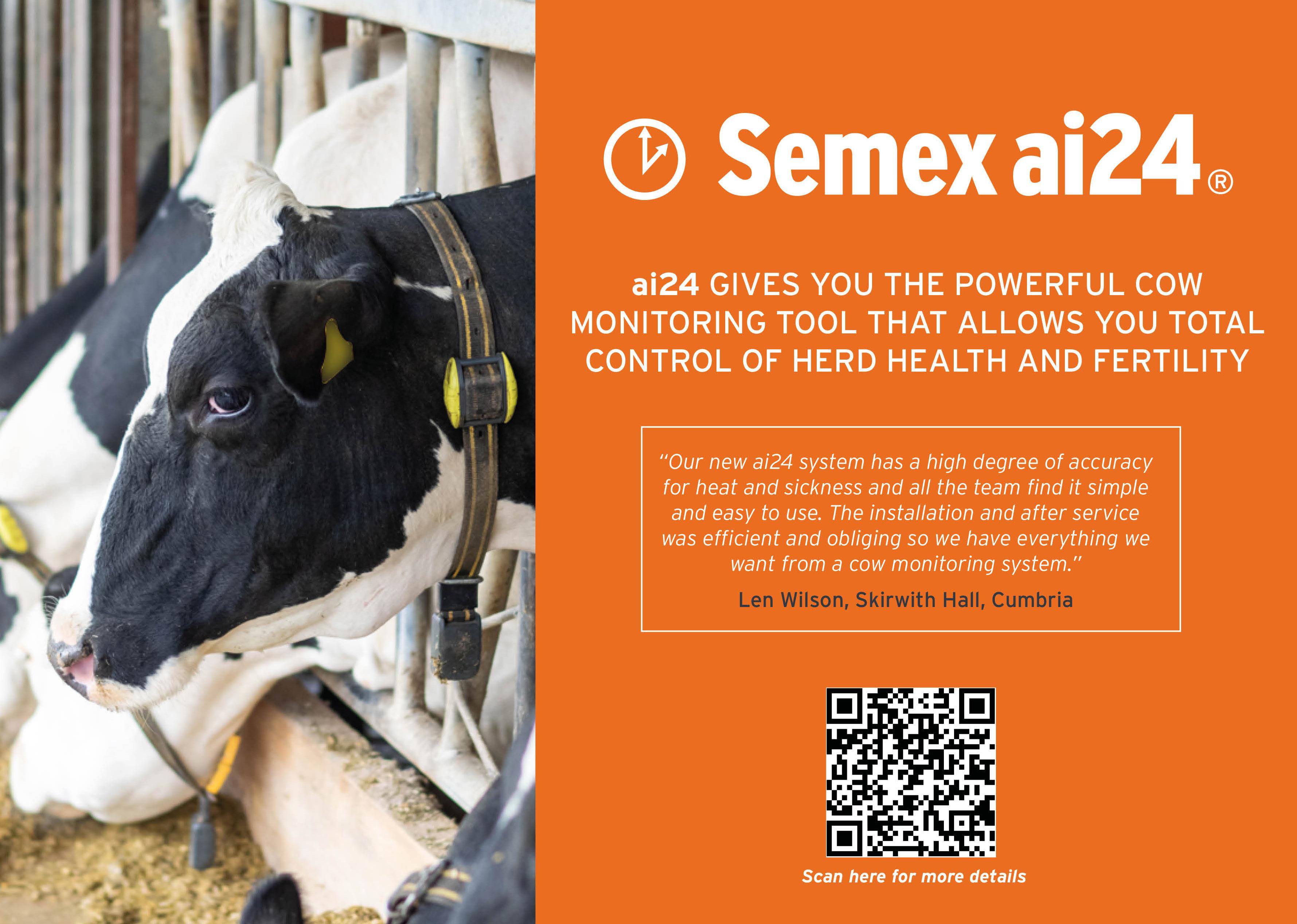 Immunity+, Genomax, Semexx, Robot Ready, Grazing Pro, SemexWorks, Optimate, Dairy Track, Calving Ease, Fertility First and Semex ai24 are all registered trademarks of Semex. Sexed semen is subject to availability. Please contact us for the latest information. Printed April 2023. E&OE. Semex UK abide by the AHDB Dairy and Holstein UK established Code of Advertising.