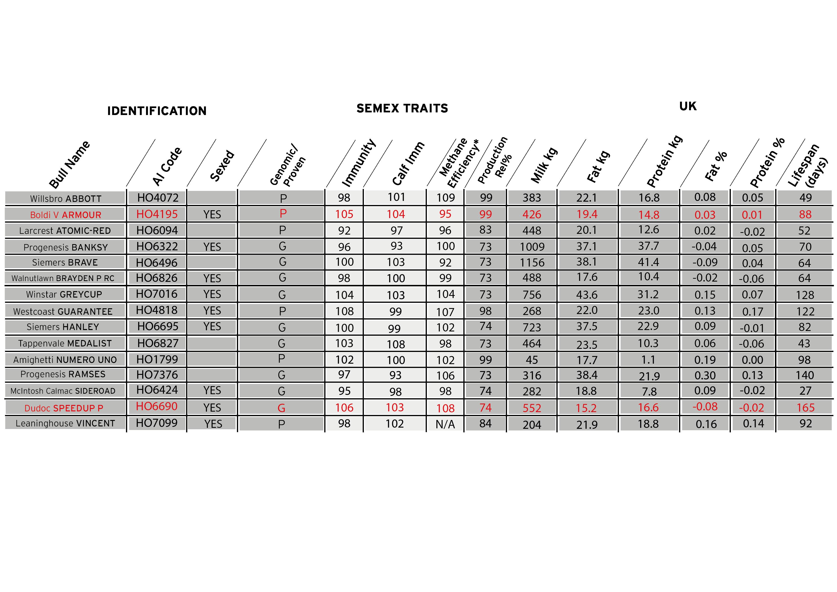 46 Proof Source: APRIL 2023 UK Production and Health and Reproduction: AHDB Dairy. Semex traits*, Immunity Indices: Semex Alliance- Methane Efficiency: Lactanet CDN. UK Type: Holstein UK. Canadian/US PTAT: Canadian Dairy Network/US CDCB as indicated. Genetic trait codes are shown whether the bull is a carrier or not