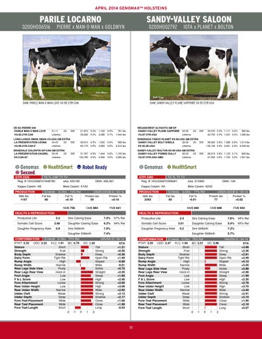 CONFORMATION G Herds G Dtrs 76% Rel HAUSA-G / 04-14 PTAT: 3.20 UDC: 2.47 FLC: 1.94 BC: 3.31 DC: 2.86 STA Stature Short Tall +3.88 Strength Frail Strong +2.36 Body Depth Shallow Deep +2.81 Dairy Form Tight Rib Open Rib +2.99 Rump Angle High Sloped +0.12 Rump Width Narrow Wide +3.55 Rear Legs Side View Posty Sickle +0.88 Rear Legs Rear View Hock-in Straight +2.06 Foot Angle Low Steep +1.99 F & L Score Low High +2.30 Fore Attachment Loose Strong +2.76 Rear Udder Height Low High +3.70 Rear Udder Width Narrow Wide +3.40 Udder Cleft Weak Strong +2.91 Udder Depth Deep Shallow +2.15 Fore Teat Placement Wide Close +1.90 Rear Teat Placement Wide Close +2.18 Fore Teat Length Short Long +0.07 -2 -1 0 1 2
