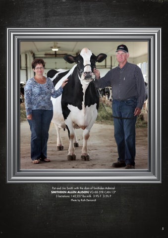 Pat and Jim Smith with the dam of Smithden Admiral SMITHDEN ALLEN ALISON VG-88-5YR-CAN 13* 3 lactations: 142,227 lbs milk 3.9% F 3.5% P Photo by Ruth Demandt