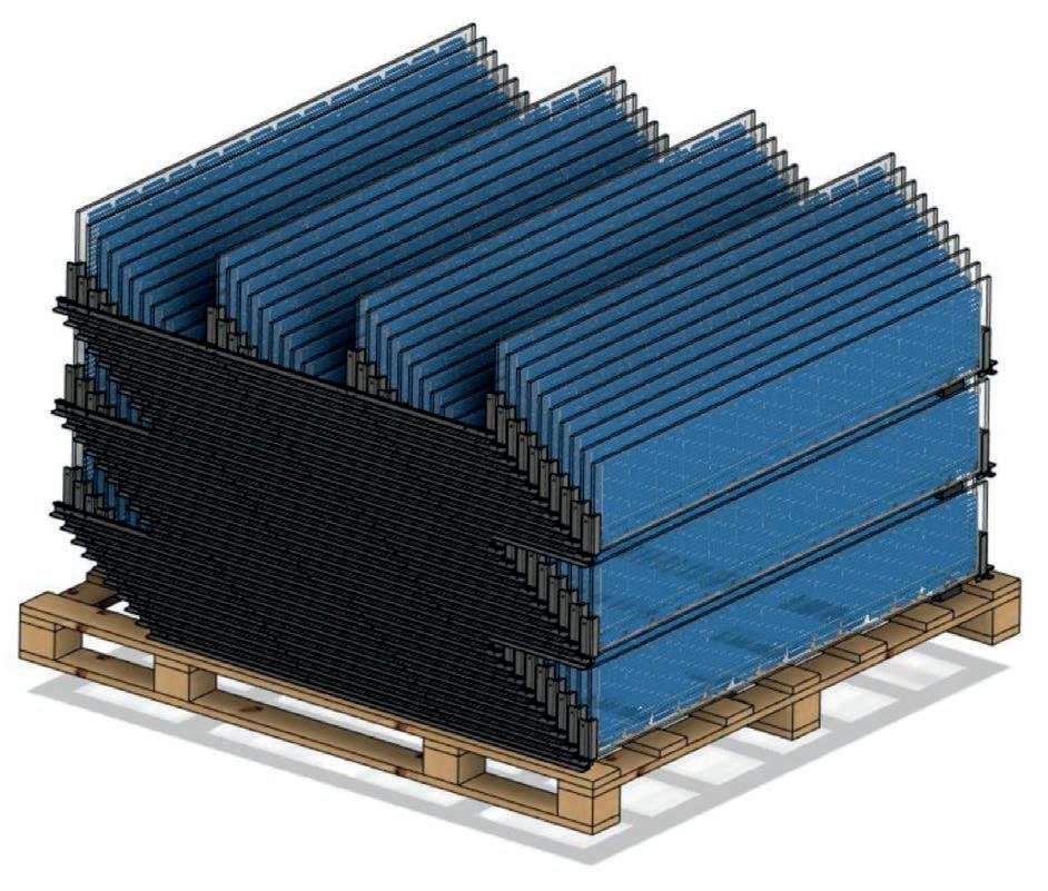 One pallet with 27 units covers 60 m2 and provides 6.9 kWp.
