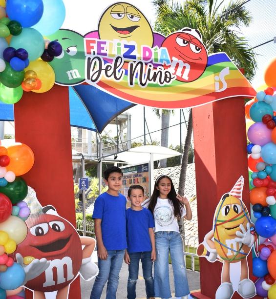 m u y g u a p o s y e n t u s i a s m a d o s a S e n d a p a r a disfrutar de su festejo del “ Día del niño”, desde la entrada se podía ver la alegría con la decoración al estilo de “ M&M 's” .