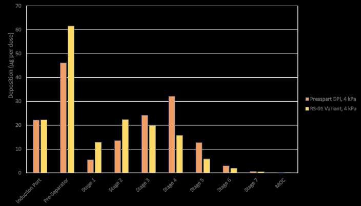 Figure 5: Comparison of NGI deposition profile of Presspart DPI and RS-01 Variant with Budesonide 200 µg Powder for Inhalation.