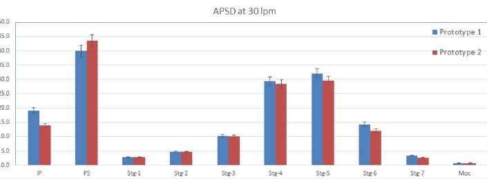 Figure 2: Comparison of NGI deposition of Prototype 1 and Prototype 2 at 30 lpm.