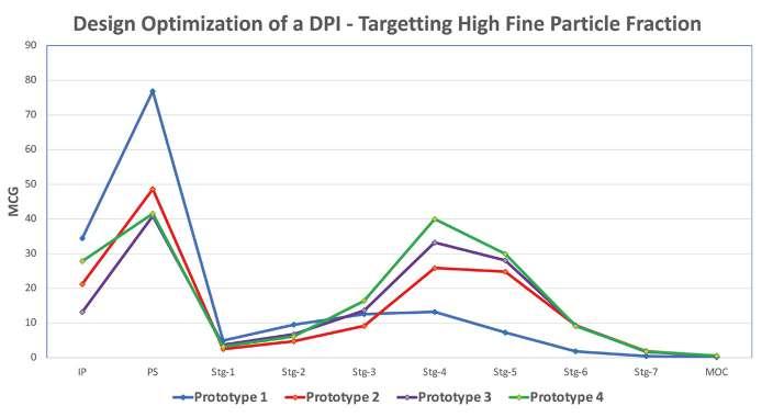 A modular engine set-up during development allowed for adapting small changes in the prototypes. Significant improvements could be achieved by changing different engine parameters. Figure 3 demonstrates the improvement in performance of the test data from Prototype 1 to 4. The NGI testing demonstrated the reduction in deposition in the Induction Port and pre-separator stage and increase in the lower stages of the impactor thereby increasing Fine Particle Fraction as we moved along our design development.
