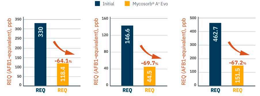 Figure 3: REQ reduction with the inclusion of Mycosorb A+ Evo at three different levels of contamination