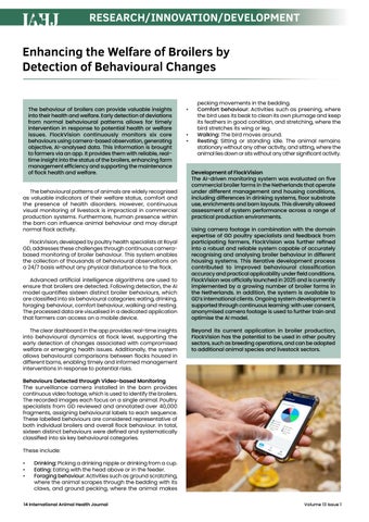 The behaviour of broilers can provide valuable insights into their health and welfare. Early de-tection of deviations from normal behavioural patterns allows for timely intervention in response to potential health or welfare issues. Jessica Hirsch-van Stek of GD Animal discusses how FlockVision continuously monitors six core behaviours using camera-based observation, generating objective, AI-analysed data. This information is brought to farmers via an app. It provides them with reliable, real-time insight into the status of the broilers, enhancing farm management efficiency and supporting the maintenance of flock health and welfare.
