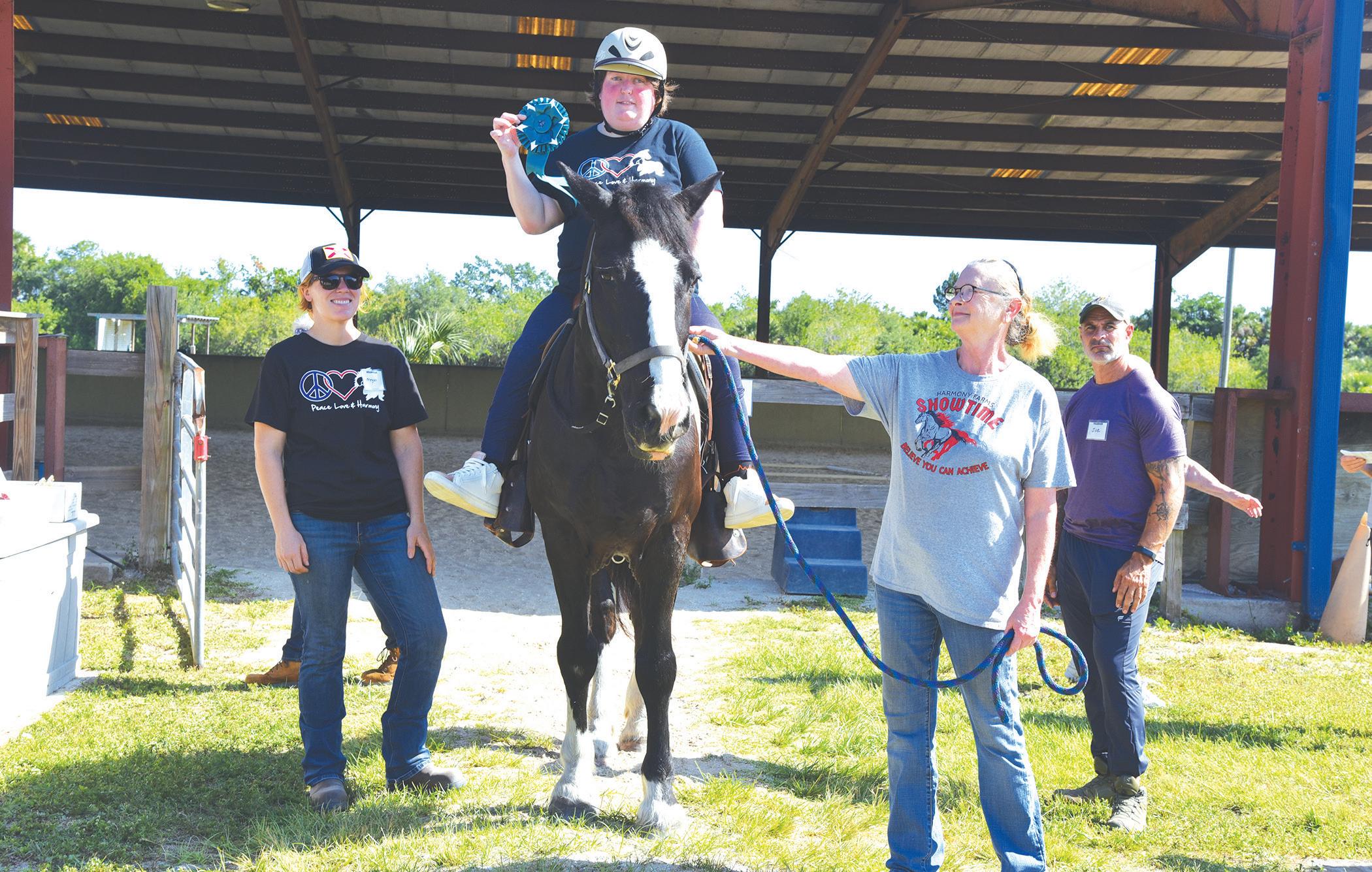 Harmony Farms has been open for 32 years and processes at least 2,000 riders per year. It relies on volunteers, and everybody mucks stalls, fills water buckets and all other jobs that need to be done. The organization is funded through donations, gifts and sponsors. Rogan said that she has never bought a horse; they have all been donated. The horses at Harmony Farms are all older than 12, have a quiet demeanor, soft, quiet eyes and “more whoa than go.”