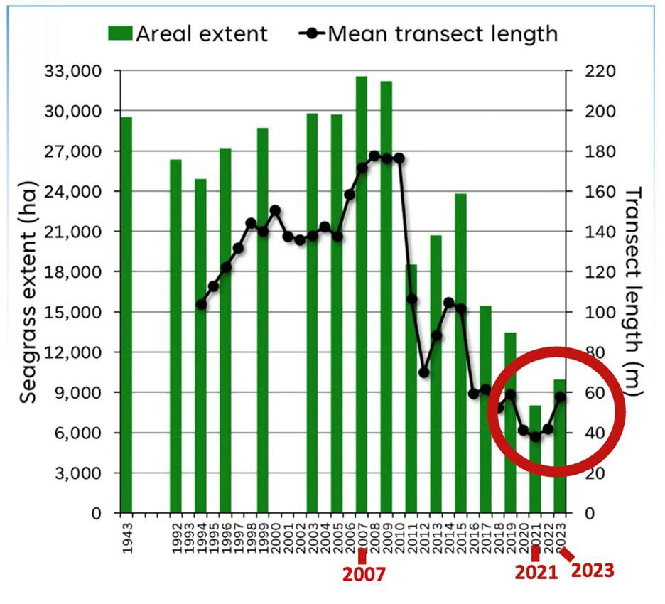 circle on the graph. The green bars (based on official St. Johns River Water Management District mapping) shows an increase in seagrass of some 2,400 Hectares (24%) between 2021 and 2023. This measurement is supported by their biannual visual assessment (black dots and lines) showing two years of seagrass increases between 2021 to 2023.