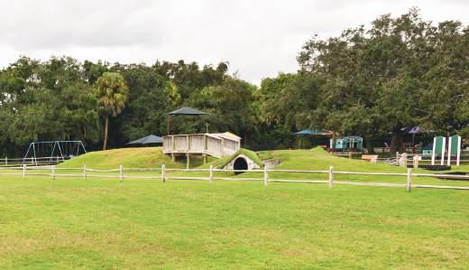 A nature playground that opened Jan. 29, 2022, it has two man-made mounds connected by a bridge above an artificial stream, and a Hobbit Hill children can explore with a tunnel that leads to a web made of ropes. There is a huge tree stump to climb that is from a tree that was struck by lightning. There also are natural rocks to climb. A 7-foot double slide off a hill offers adventure as does a bridge crossing. There are swings for children and a baby swing.
