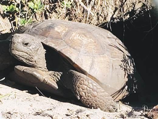 A timid Gopher Tortoise emerges from his den at the Hundred Acre Hollows conservation area.