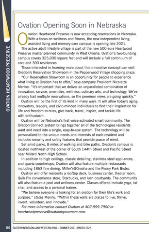 vation Heartwood Preserve is now accepting reservations in Nebraska. With a focus on wellness and fitness, the new independent living, assisted living and memory care campus is opening late 2021. The active adult lifestyle village is part of the new 500-acre Heartwood Preserve master-planned community in West Omaha. Ovation’s two-building campus covers 325,000 square feet and will include a full continuum of care and 300 residences. Those interested in learning more about this innovative concept can visit Ovation’s Reservation Showroom in the Pepperwood Village shopping plaza. “Our Reservation Showroom is an opportunity for people to experience what living at Ovation has to offer,” says company President Nicolette Merino. “It’s important that we deliver an unparalleled combination of innovation, service, amenities, wellness, culinary arts, and technology. We’ve already had multiple reservations, so the premium views are going quickly.” Ovation will be the first of its kind in many ways. It will allow today’s aging innovators, leaders, and civic-minded individuals to find their inspiration for life and freedom to relax, give back, travel, inspire, and tackle life with enthusiasm. Ovation will be Nebraska’s first voice-activated smart community. The Ovation Connect system brings together all of the technologies residents want and need into a single, easy-to-use system. The technology will be personalized to the unique needs and interests of each resident and includes security and safety features that provide peace of mind. Set amid parks, 8 miles of walking and bike paths, Ovation’s campus is located northwest of the corner of South 144th Street and Pacific Street near Millard North High School. In addition to high ceilings, classic detailing, stainless steel appliances, and quartz countertops, Ovation will also feature multiple restaurants including 1863 fine dining, Miller’s@Omaha and the Peony Park Bistro. Ovation will offer residents a rooftop deck, business center, theater room, Quik Pik convenience store, Starbucks, and lush courtyards. The community will also feature a pool and wellness center. Classes offered include yoga, tai chai, and access to a personal trainer. “We believe everyone is looking for an ovation for their life’s work and purpose,” states Merino. “Within these walls are places to live, thrive, invent, volunteer, and innovate.” For more information contact Ovation at 402-999-7900 or heartwoodpreserve@ovationbyavamere.com.