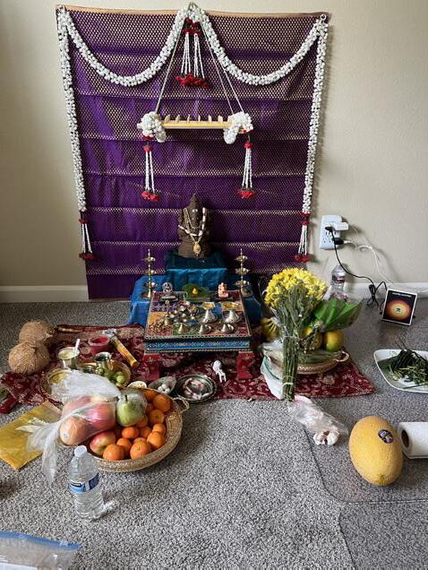 Ganesh Chaturthi Altar. Ganesh Chaturthi is a Hindu celebration honoring the god, Ganesh. Hindu families traditionally build an additional altar within their homes in honor of the current god or goddess. During this time, gifts and items to be blessed are left before the altar while people puja. Puja encompasses prayer, rituals, and songs.
